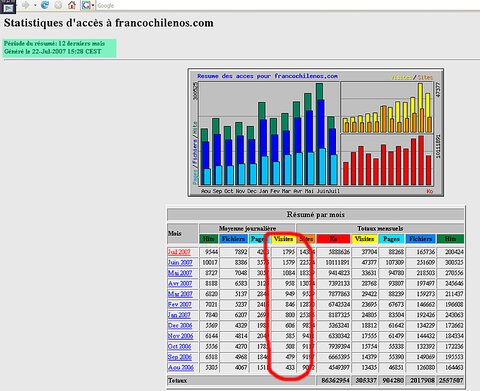Eh oui, en cette veille de vacances pour une bonne partie d’entre nous, nous voulons vous remercier de votre fidélité et de votre confiance. Avec vous et grâce à vous, Francochilenos.com est devenu au fil de ses 8 années d’existence, une bouillonnante communauté qui, à raison de plus de 1700 visites pas jour (voir le doc ci-dessous), fait de cet espace un lieu de vie de l’amitié francochilienne. Une amitié qui, depuis cette année, s’élargit volontiers à d’autres (…)