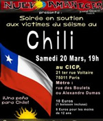 Des nombreuses initiatives solidaires marquent ces jours-ci l’amitié franco-chilienne. Elles sont nées aussi bien d’institutions que d’associations et des personnes voulant donner un coup de main au Chiliens pour faire face aux conséquences du récent tremblement de terre. Nous proposons ici une liste [1] des actions solidaires dont la vocation est de s’enrichir des nouvelles initiatives que nous vous invitons d’ores et déjà à nous le faire connaître.