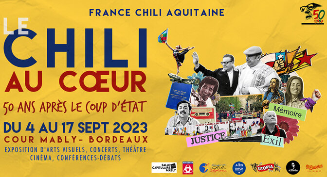 L’Association France Chili Aquitaine organise du 4 au 17 septembre 2023 deux semaines d’activités artistiques et culturelles pour commémorer les 50 ans du coup d’État. Des expositions, des projections, des ateliers, des conférences, des rencontres et des concerts avec, au programme, parmi bien d’autres activités :