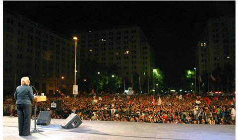 16 mars 2006, écrit par Eduardo Olivares PalmaIl fait très chaud, nous sommes en pleine Alameda, face à la Moneda, il est 3 heures de l’après midi et la foule commence déjà a se serrer derrière les barrières qui entourent la scène où dans quelques minutes va commencer la grand fête « Canta America Canta » la grande manifestation populaire et culturelle qui doit clôturer les cérémonies d’investiture de la nouvelle presidenta Michelle Bachelet.