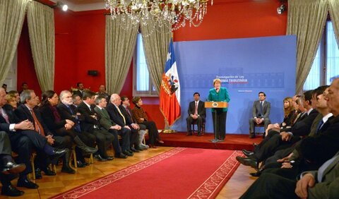 27 septembre 2014"J’ai promis que la mission de ce gouvernement serait de réduire les écarts injustes qui séparent nos compatriotes et entravent notre croissance" a affirmé la présidente chilienne en promulguant la loi destinée à augmenter les ressources de l’Etat de l’équivalent de 3% du PIB.